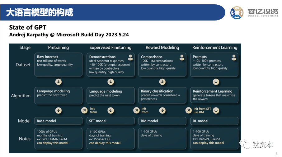 回到大语言模型本身,推荐大家去看OpenAI联合创始人Andrej Karpathy之前在微软开发者大会上分享的State of GPT主题演讲。他将大模型的训练过程拆解成了四个阶段: