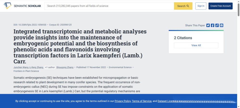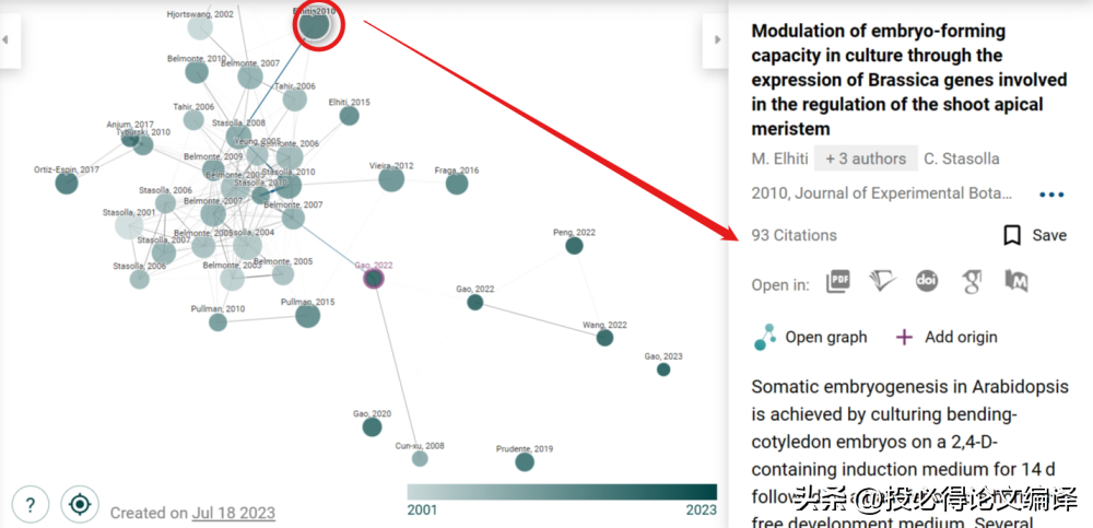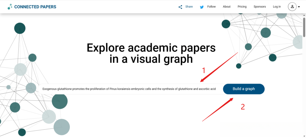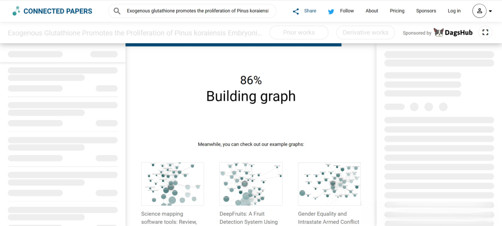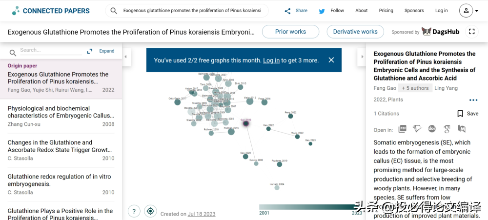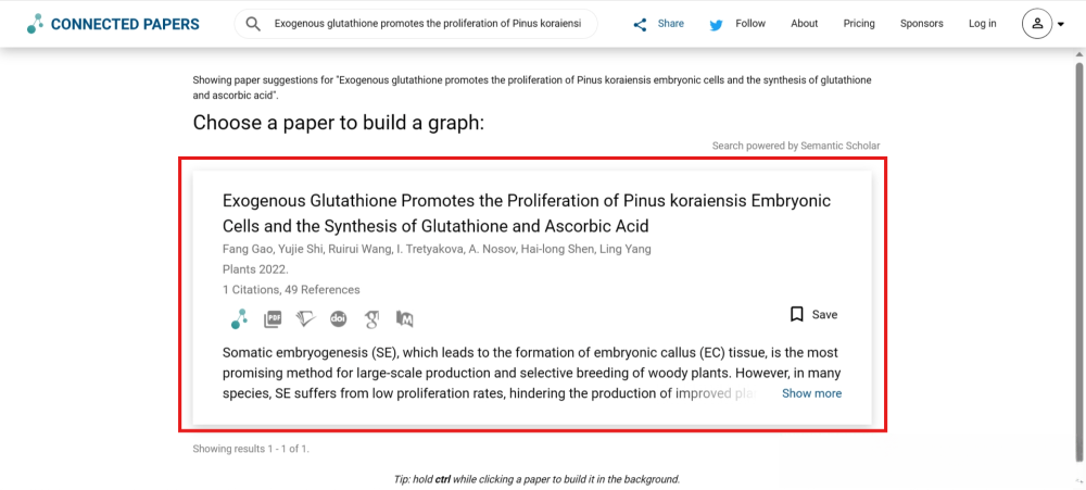 个人测评 笔者以一篇2022年发表的SCI论文为例演示。 题目:Exogenous glutathione promotes the proliferation of Pinus koraiensis embryonic cells and the synthesis of glutathione and ascorbic acid DOI: https://doi.org/10.3390/plants11192586 打开Connected Papers网站,将论文题目复制粘贴到Connected Papers的搜索框中,点击【Build a Graph】,如下图所示。 ![]() Connected Papers会搜索这篇论文,并将搜索结果以卡片的形式显示,如下图所示。点击选择这篇论文,生成一张图。 ![]() Connected Papers会开始生成图,这个过程以百分数的形式展现,整个过程非常快,如下图所示。 ![]() 完成可视图生成工作以后,Connected Papers网站如下图所示。左侧是原始论文和相关论文列表,中间是类似于社交网络的文献可视图,右侧是当前选中论文的基本信息。 ![]() 其中,可视图可以通过鼠标滚轮放大缩小,也可以将左右侧面板隐藏。