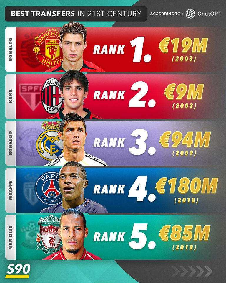 Score90官方更新社媒,发布了Chatgpt评选出的21世纪最佳转会TOP10,其中C罗转会曼联位居第一,且C罗两次上榜。