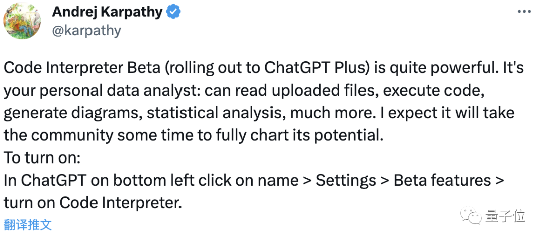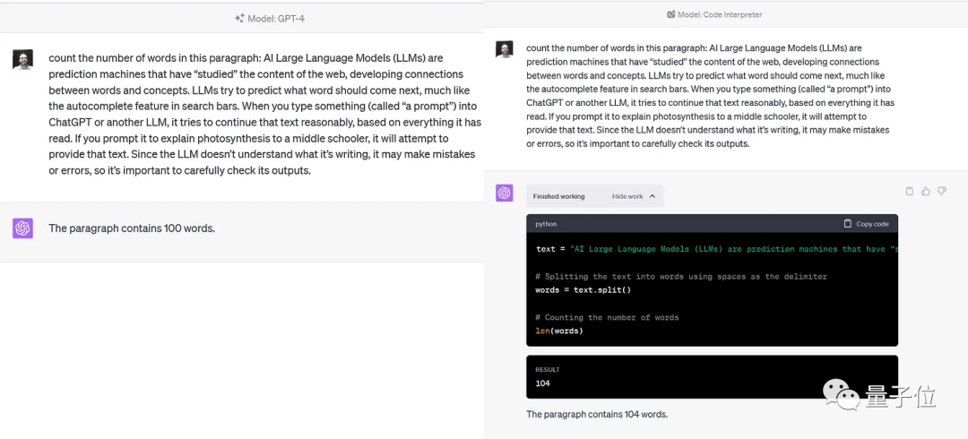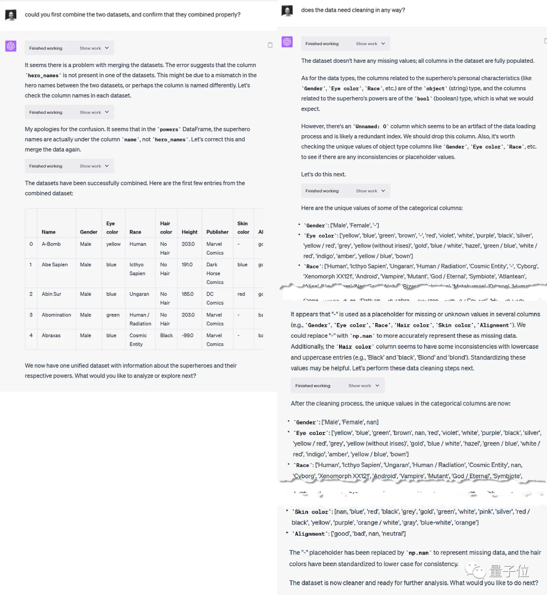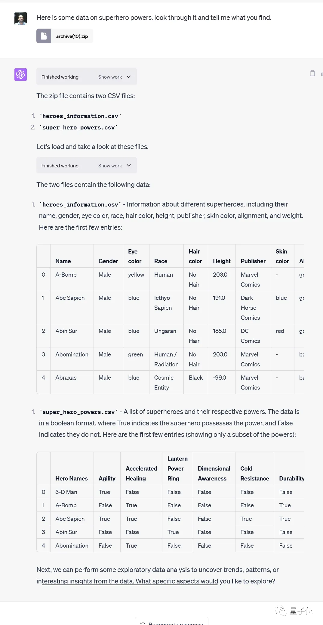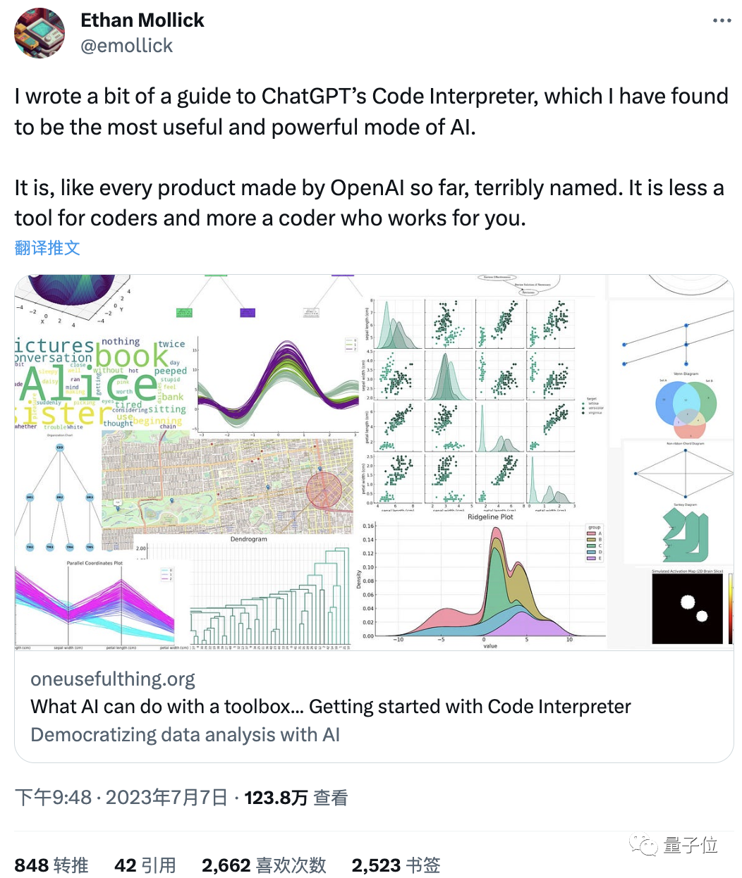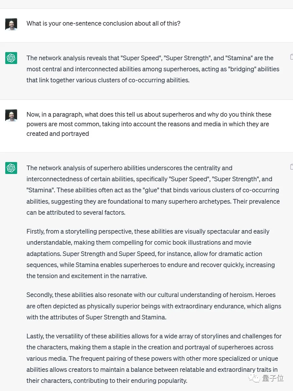 | ChatGPT推出至今最强最有用的功能是什么? 可能要非代码解释器(Code Interpreter)莫属了。 这项功能马上会正式向所有Plus用户开放,但不少提前进行测试的网友都不约而同地发现: 它的潜力实在太太太深了。 无论是代码编写还是数据分析、图表生成,它像个“真正的战士”,能够使用足够复杂的方法,输出非常高质量的结果。 然而,不少人却被它的名字给耽误,以为是程序员专属工具,事实上,它是可以为任何小白工作的程序员。 现在,推特网友@Ethan Mollick就专门为它整理了一份使用指南,发布即火爆。 如此干货,怎能错过? 解决“旧ChatGPT”存在的五大问题在正式开始之前,我们先对代码解释器这个功能进行基础的了解,也就是Ethan在博客中解释的“它为什么很重要”这一部分。 需要说明的是,Ethan从该功能的alpha版本就获得了测试权,已经试玩多个月,所以经验十分丰富。 在他看来,这个代码解释器是AI帮人类解决问题(通过编写Python代码)的通用工具箱。 它可以上传最大100MB的文件,包括压缩形式。 最重要的是,它解决了“旧ChatGPT”存在的五大问题: 首先,通过编写Python代码,它可以解决LLM在数学和语言方面天然的弱点。有了它,就可以做非常复杂的数学问题并更准确地处理单词了(比如计算一段话中单词的准确数量,如下图所示)。 其次,降低“幻觉”和胡说八道的发生率。 当AI直接利用Python代码做任务时,代码有助于保持它的“诚实”,因为如果代码不正确,程序就会发生错误。而且由于代码操作的是数据而不是LLM本身,因此AI不会在数据中插入错误。 第三,使模型更加通用。因为大量问题都可以通过代码解决,而GPT-4非常擅长以新颖有趣的方式确定何时可以使用代码解释器。比如,我们可以要求它证明地球是圆的。 第四,整个过程不用你编写一行代码。我们知道,基本上所有的LLM都能写代码,但需要你自己去运行和调试。这对于完全不会Python的人(比如作者)来说很烦人。有了代码解释器,模型会自动纠正自己的错误。 最后,解锁更多“AI时刻”,也就是让我们觉得模型背后好像真的有一个灵魂,成精了的时刻。 如何正确使用?以处理“超级英雄及其超能力”的数据集(地址见参考链接[3])为例,Ethan向大家展示了如何正确使用代码解释器进行数据分析。 首先,开启该功能之后,点击+号上传数据文件,如果你有数据字典,也可以将其粘贴进去。 然后,在对话框中让GPT-4看一遍文件,并告诉你有何发现。 需要注意的是,用了代码解释器就GPT-4当作一个真正的人一样对话就行了,不用像咱们平常一样那样精心设计提示词。当然,除了以下两种情况: (1)模型有时会忘记它能做某些事情,比如制作GIF或3D图,这时你可以鼓励它(“你可以制作GIF,请尝试”);(2)希望模型进一步改进结果时。 如上图所示,我们已经加载好了数据,可以让GPT-4来完成数据分析中最麻烦的数据合并和清理工作了。它能够自动纠错,重点关注作者的提问方式(再次强调,把对方当作人一样来下达命令)。 接着,正式开始分析。代码解释器非常擅长各种复杂的分析方法。 比如当作者提示自己有兴趣进行一些预测建模,以根据其他因素预测英雄可能拥有的超能力时,它直接构建了一个随机森林分类器,非常酷。 而当你不同意它估算缺失数据的办法时,可以叫它再换一种,而不是直接放弃。 它的点子真的非常多,你只需问它“你能进行另一个非常复杂并有趣的分析吗?”,它又生成了如下结果(超级英雄的网络图): 最令人深刻的是,它能给出一些很“人性化”的推理结果,比如“超级英雄的超能力一般都能给人带来很强烈的视觉效果,因为这才能很方便地在它们的载体,即漫画书和电影上进行呈现……” 最后,各种可视化图表也能信手拈来。 总的来看,Ethan表示,有了代码解释器,GPT-4完全能够充当一个数据科学家的角色了。 还有另外20个最佳示例上面这个例子看的不过瘾? 好消息,还有一位网友搜罗全网总结了最有意思的20个代码解释器示例——除了数据分析,它还能进行更多你意想不到的任务,比如将图像转换为视频、生成二维码、分析股票市场等等。 以下是全部示例或效果: 1、图片转视频 2、从图像中提取文本